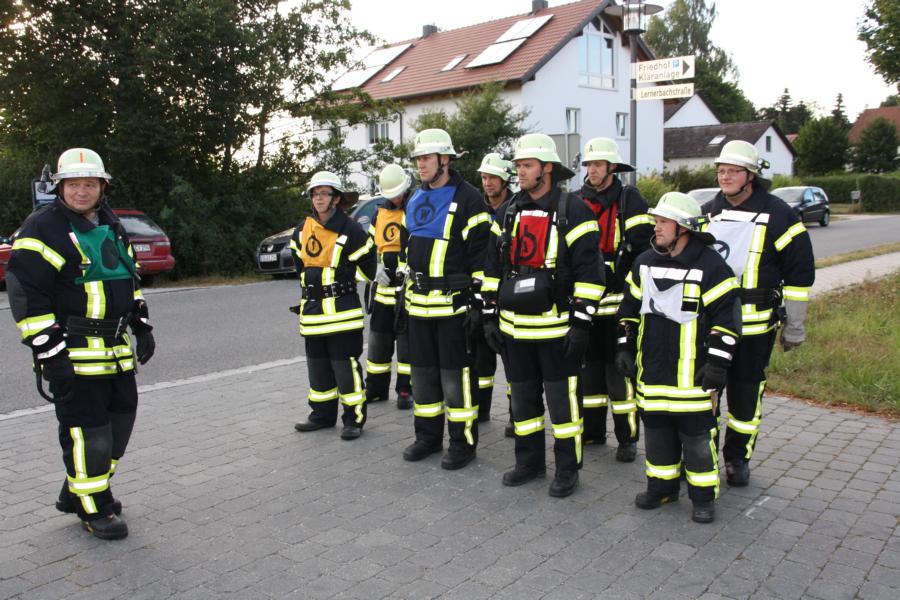 Neu war erstmalig, dass die Prüfung mit Atemschutz durchgeführt wurde. Hierbei rüsteten sich 4 Männer mit Pressluftatmern aus und gestalteten somit den Aufbau. Nachdem die einzelnen Posten ausgelost waren und der Gruppenführer die schriftlichen Fragen beantwortet hatte ging es auch schon zur Sache. Knoten und Stiche, Aufbau und Trockensaugprobe mussten in den vorgegebenen Zeiten bewältigt werden. Dabei wurde der Ablauf mit kritischen Augen der Schiedsrichter begutachtet und mit bravour bestanden.